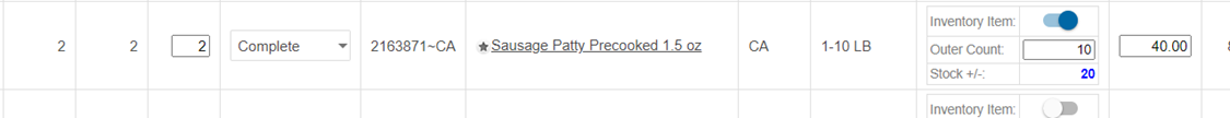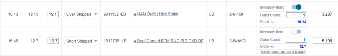 Items ordered by weight and counted in weight should leave outer count set at 1. In this example the Ham was shipped 19.13 LBS, and we want to put 19.13 LBS. in stock, so the outer count remains 1.