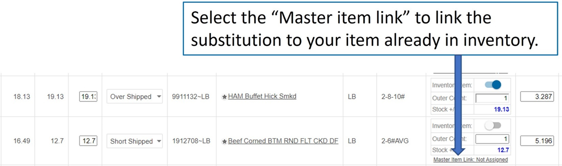 Substitutions should be linked to your master inventory item. When an item is substituted it should be mapped to the Master inventory item. Leave the inventory item toggle switch in the off position and select the master item link to associate the substitute item to your master inventory item.