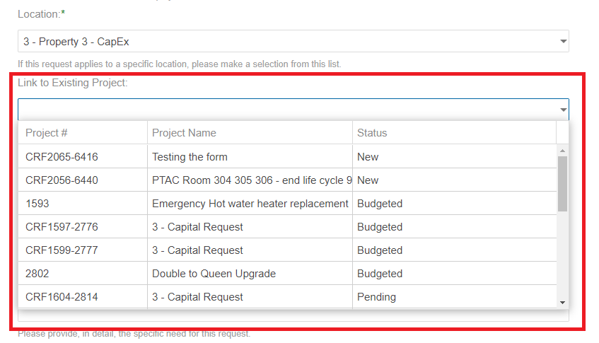 5. Select an existing project to link the Capital Request to, if applicable. This will attach all the information within the Capital Request to the existing project and a new project will not be created.