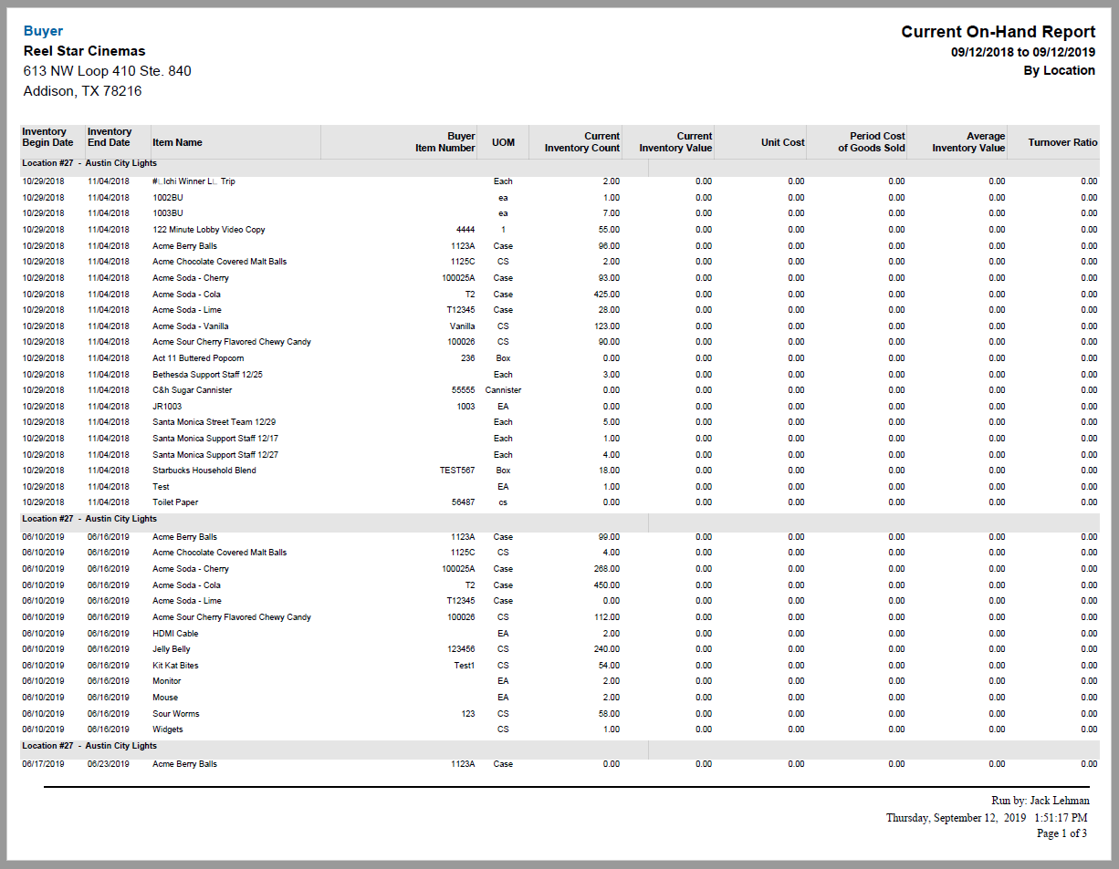 Inventory | Current On-Hand Report | List of items and item information relating to a location’s inventory. | |